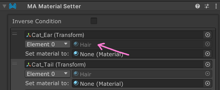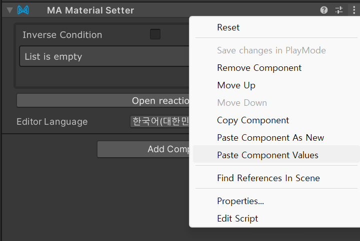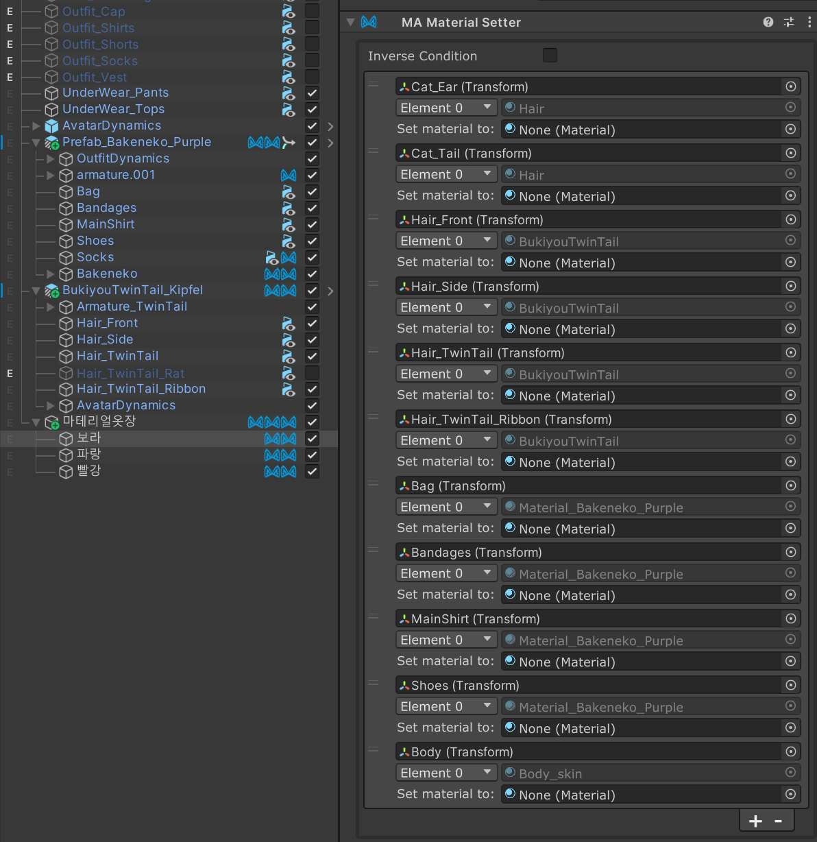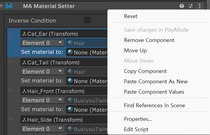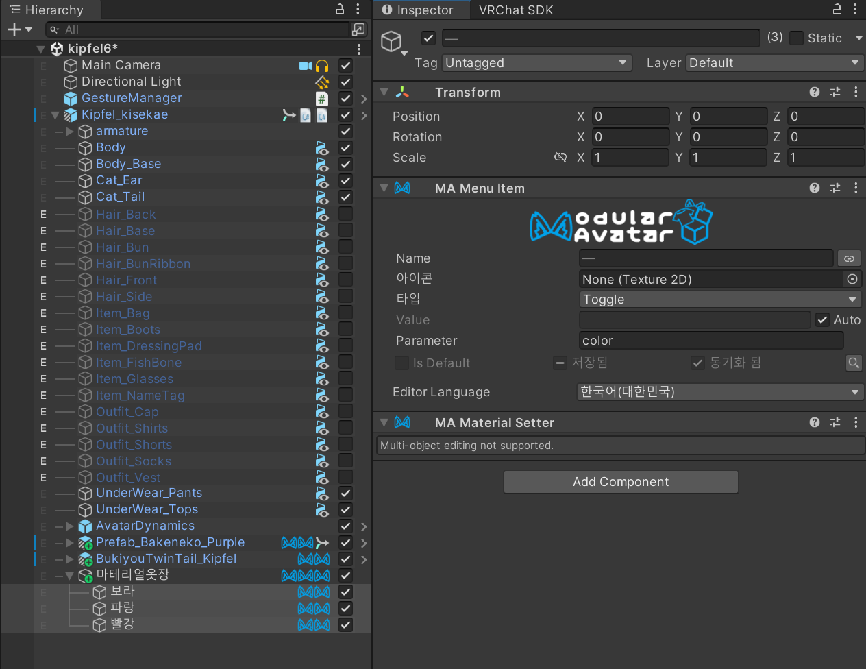 하위 오브젝트를 전부 선택하고, MA Menu Item과 MA Material Setter를 추가합니다.