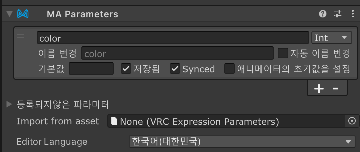 MA Parameters는 + 버튼을 눌러 파라미터를 추가하고, 이름을 지정하고, 유형은 Int로 해 줍니다.