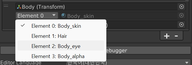 예시로 Kipfel 아바타의 Body는 피부/눈썹/눈/특수효과 로 마테리얼이 구성되어 있습니다.