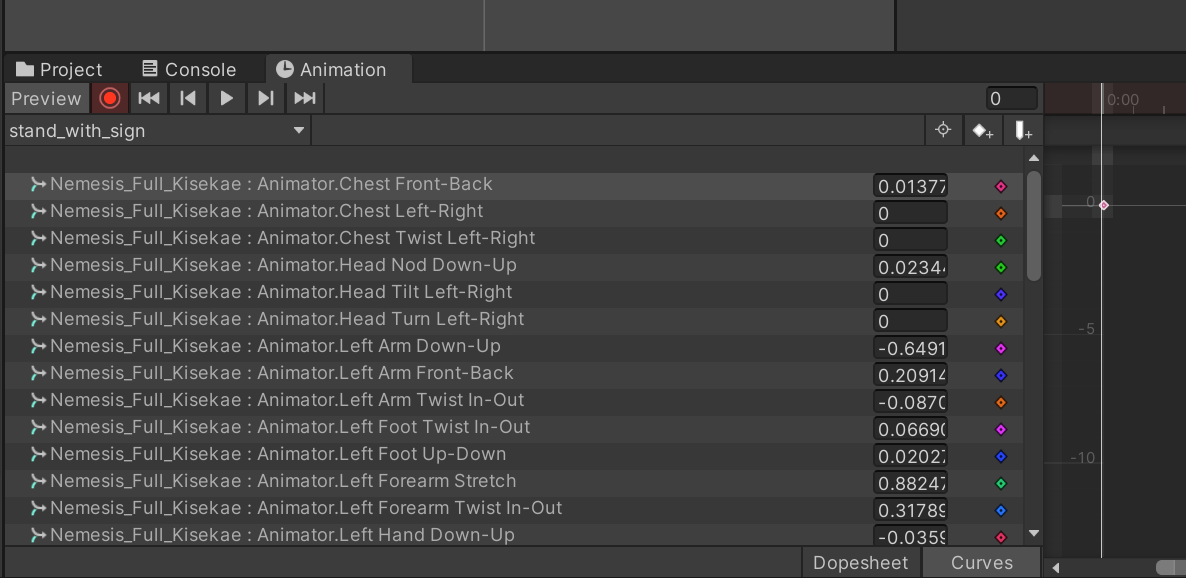 애니메이션 창에서 하단 Dopesheet를 Curves로 전환한 다음,