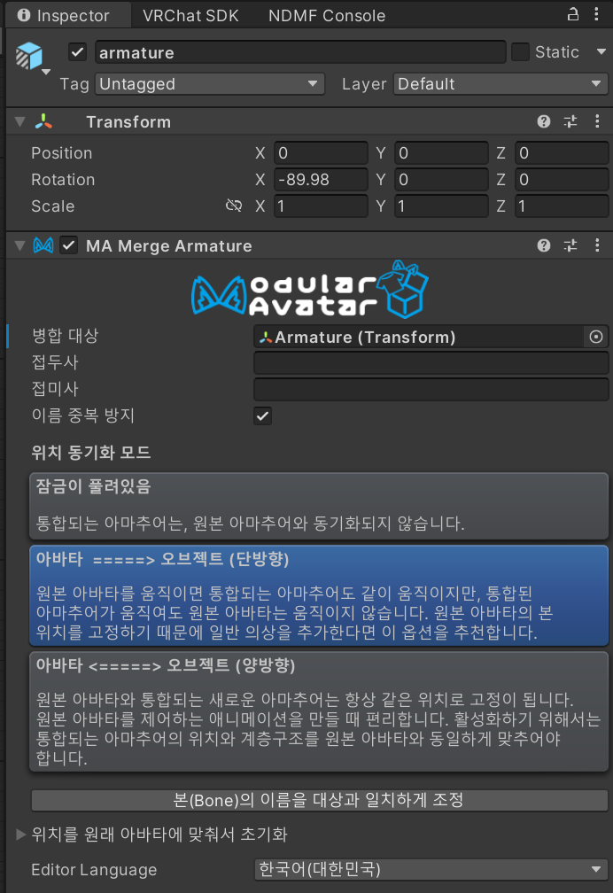 해당 에셋의 Armature에서 Merge Armature 컴포넌트의 잠금을 풀고 다시 잠궈 주세요.
