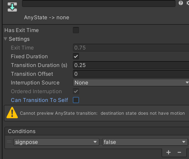 트랜지션의 Settings를 열어, Can Transition to self를 꺼 줍니다.