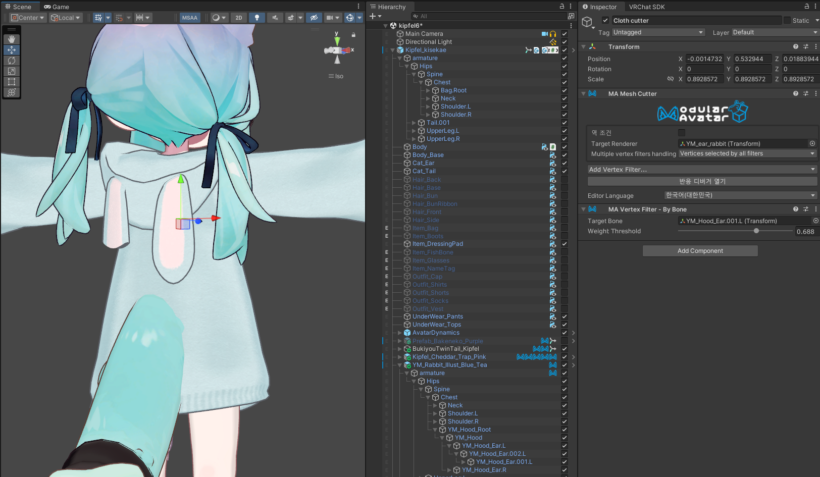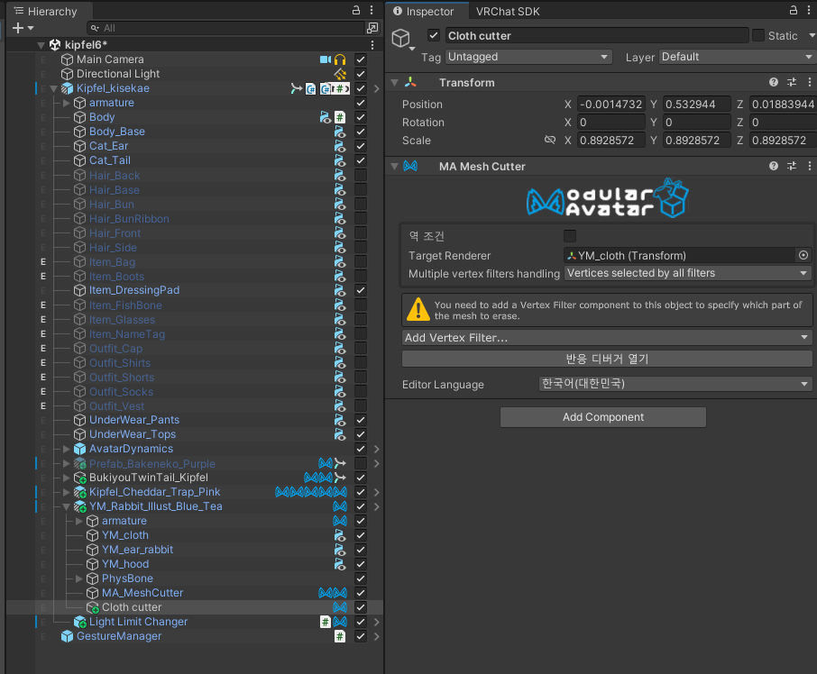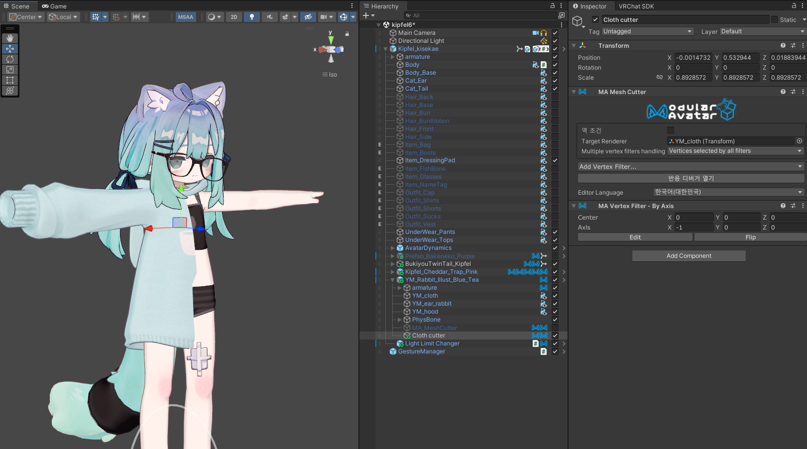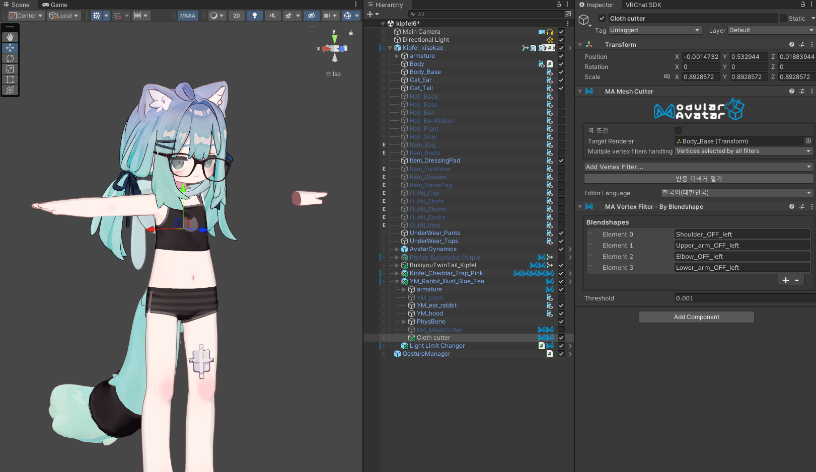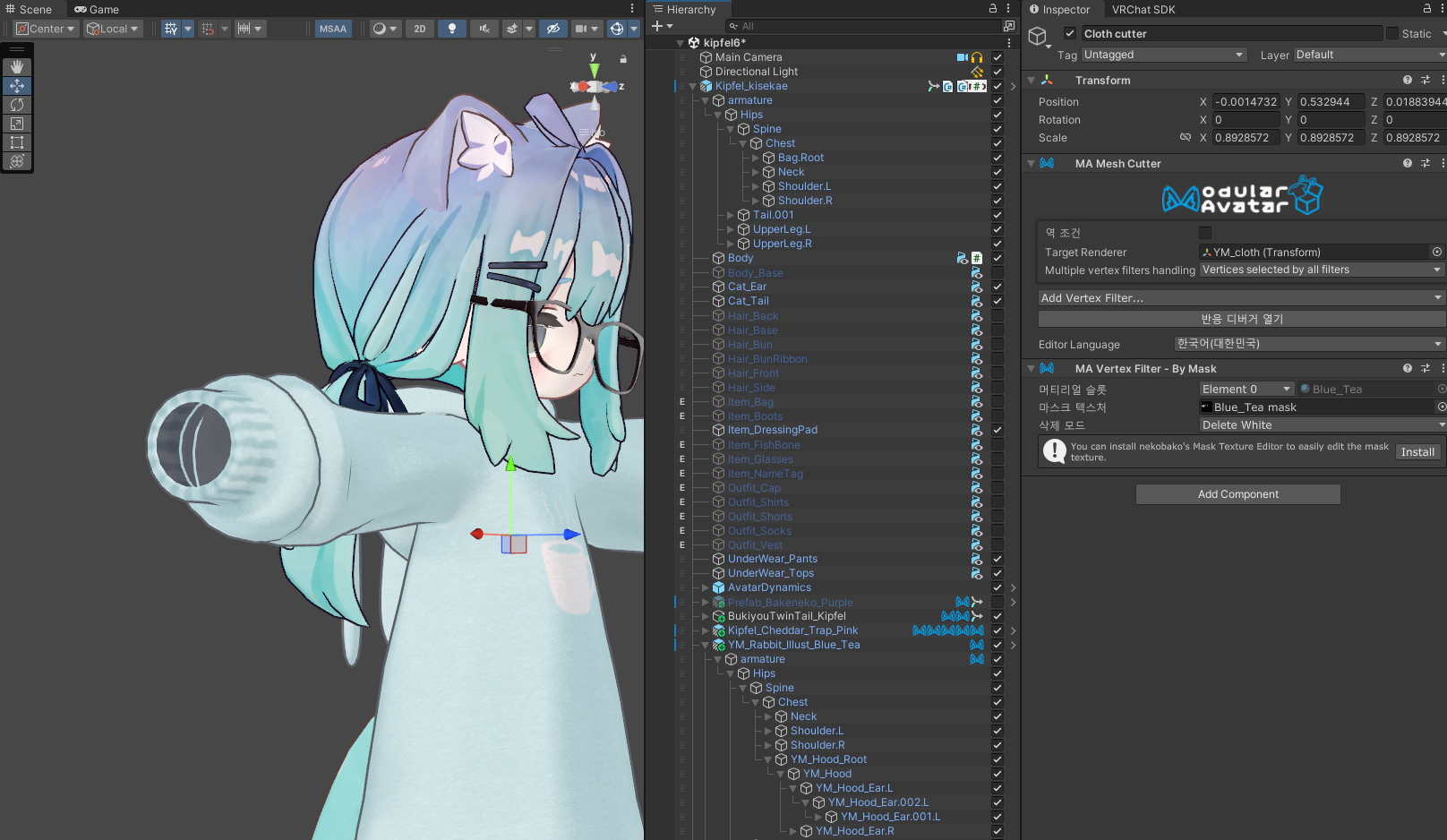 단순 메쉬 제거는 AAO: Avatar Optimizer나 MeshDeleterWithTexture 같은 도구로도 쉽게 가능합니다.