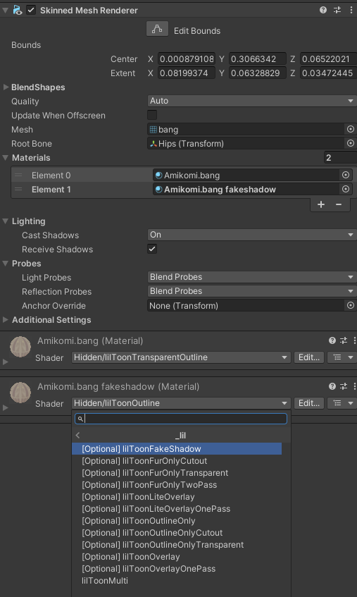 복제한 마테리얼의 쉐이더를 _lil > lilToonFakeShadow 로 변경합니다.