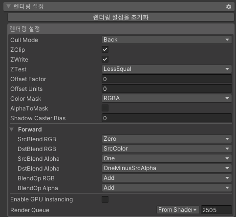 fakeshadow 마테리얼 > 렌더링 설정 > Forward에서 색이 합성되는 방식을 정하는데요,