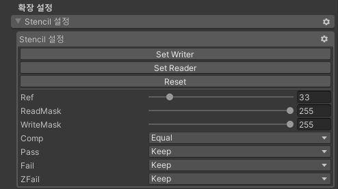 기존 앞머리는 스텐실 기본값인 Ref 0, Comp Always로 지정되어 있습니다.