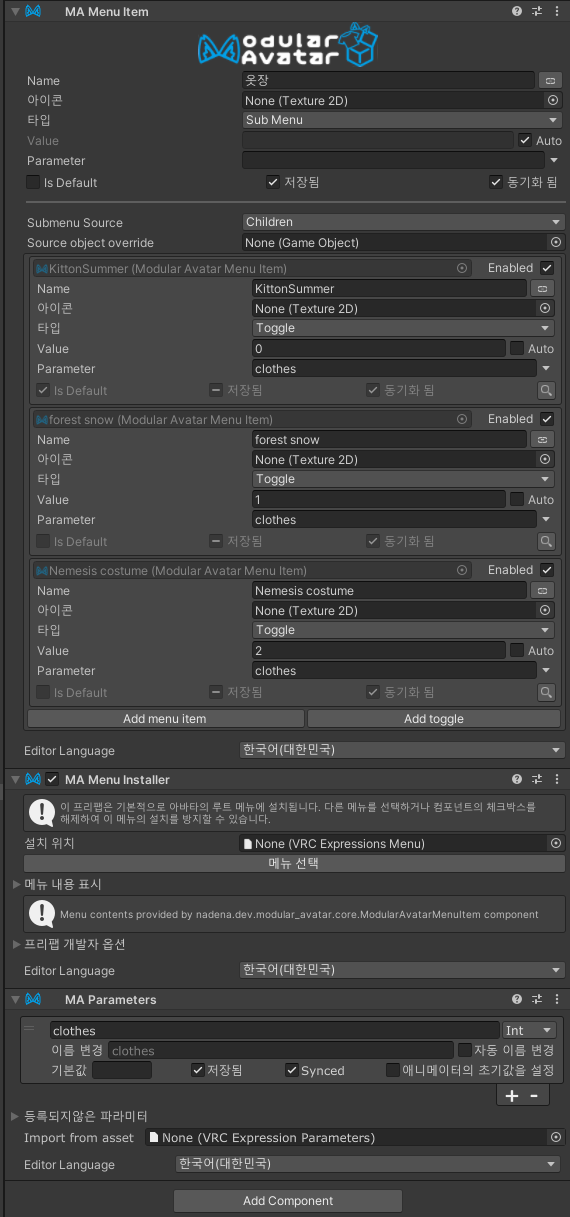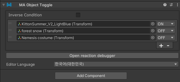 의상 이름으로 된 오브젝트들에 [MA Object Toggle] 컴포넌트를 추가하고,