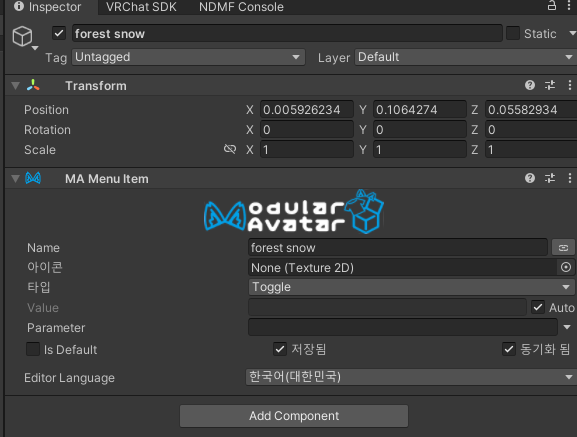 설정한 토글 메뉴를 아바타 메뉴에 추가해주는 컴포넌트입니다.