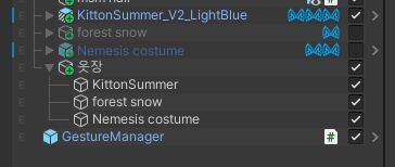 각각 의상의 이름으로 빈 오브젝트를 만들어 [옷장] 안에 정리했습니다.