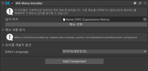 이제 [옷장] 에 [MA Menu Installer] 컴포넌트를 추가합니다.
