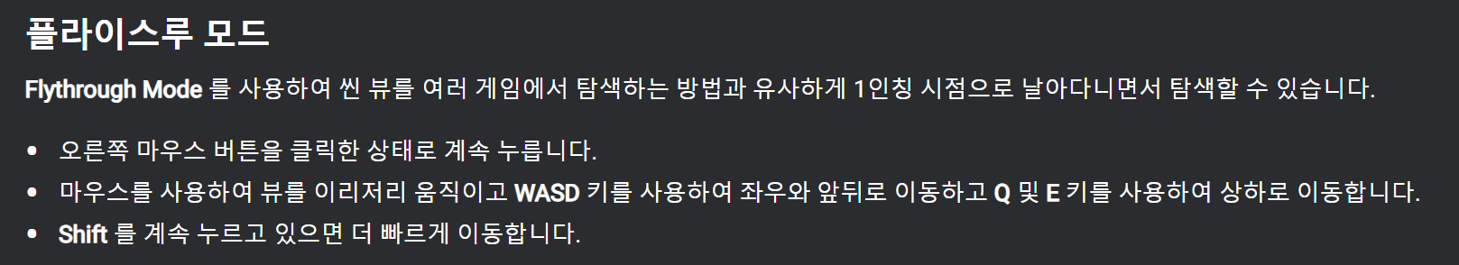Iso 모드에서는 Flythrough 단축키로 카메라가 앞뒤로 움직이지 않는다는 점을 주의해 주세요.